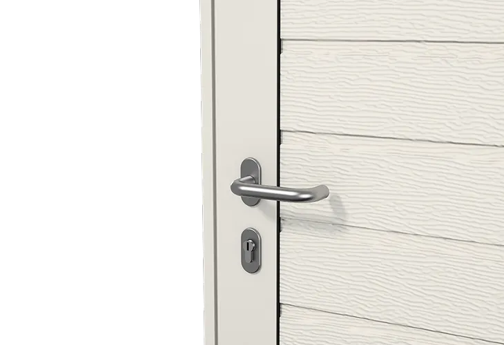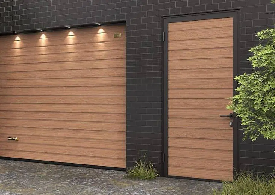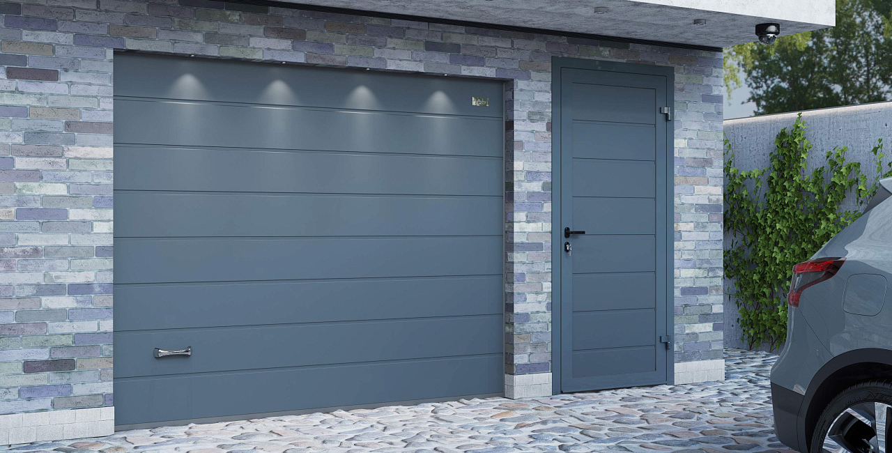 Создайте гармоничный тандем в экстерьере гаража. Для этого достаточно заказать боковую дверь в едином стиле с секционными воротами.